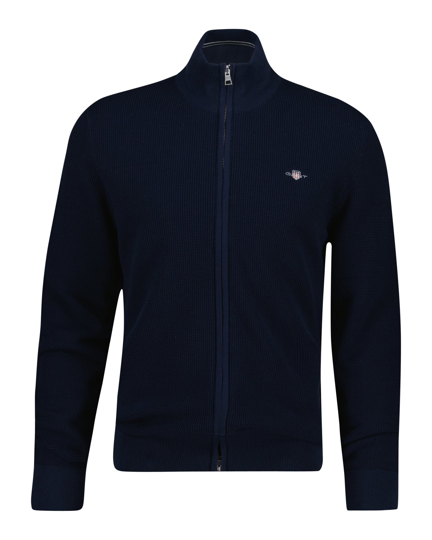 Marine blå cardigan med struktur og glidelås.