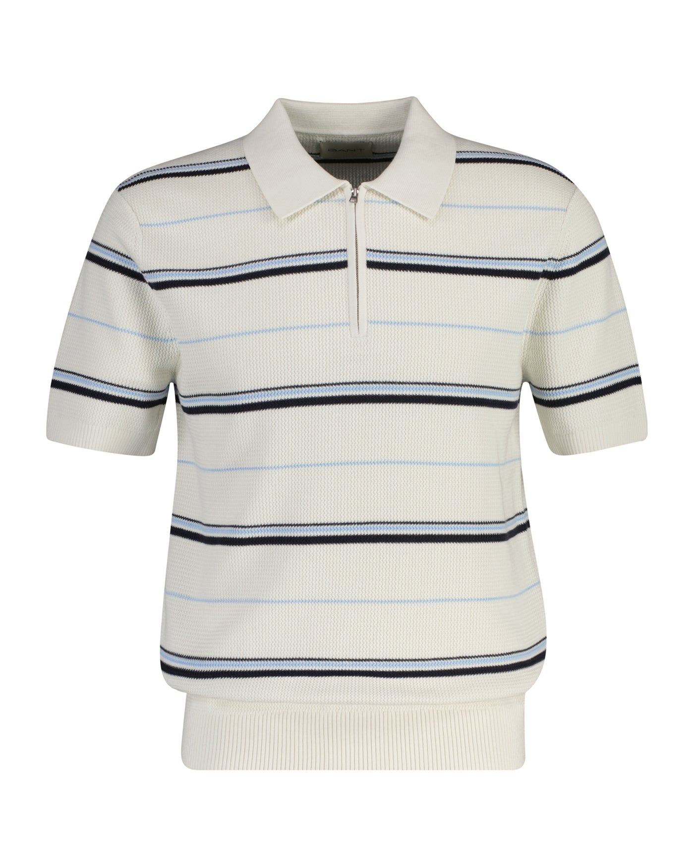 Off-white pique med zip og blå striper og ribbestrikk nede.