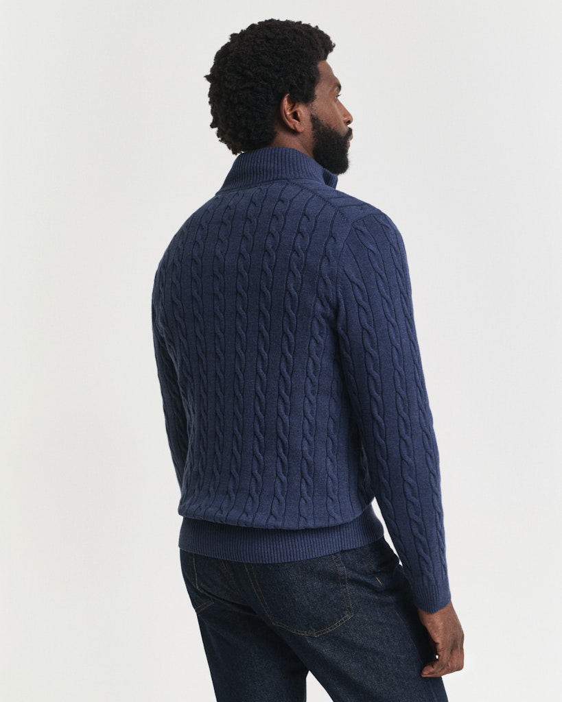 Jeansblå kabelstrikker half zip genser.